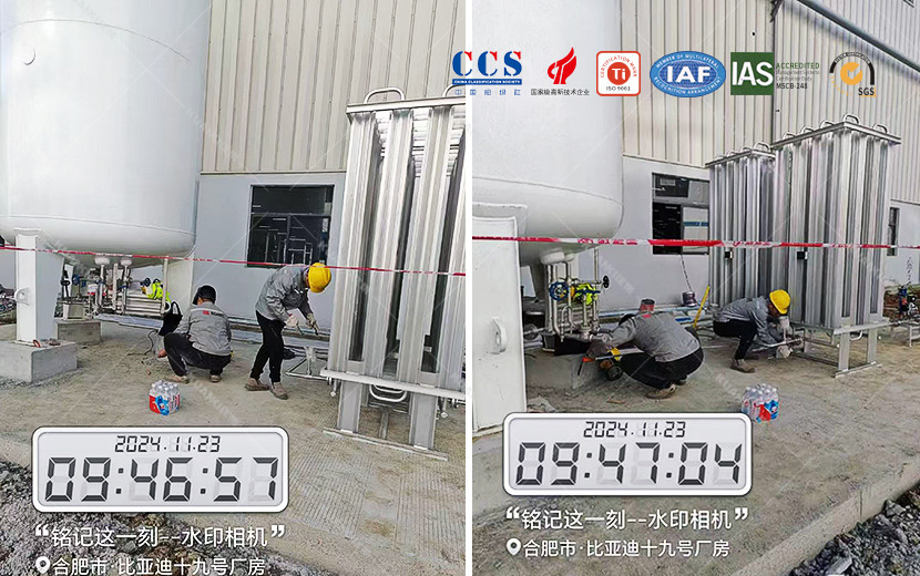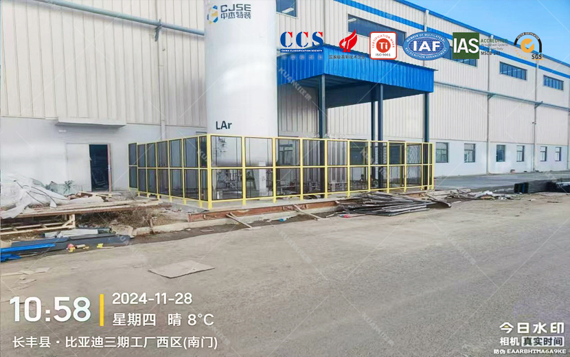 合肥长丰比亚迪客户三期19号厂房,新建电机工厂车间,现需要氩气集中供气方案,经跟客户沟通,前期设计用量到现场的布置施工都有我公司提供。这套设备所用到的设备有:储罐、汽化器、调压阀组、流量计、配电箱、低压报警系统、管道及护栏安装。
