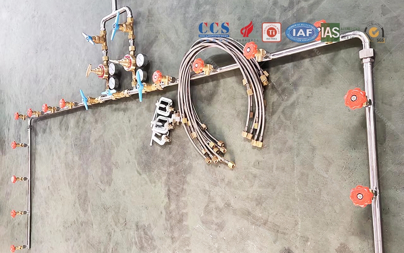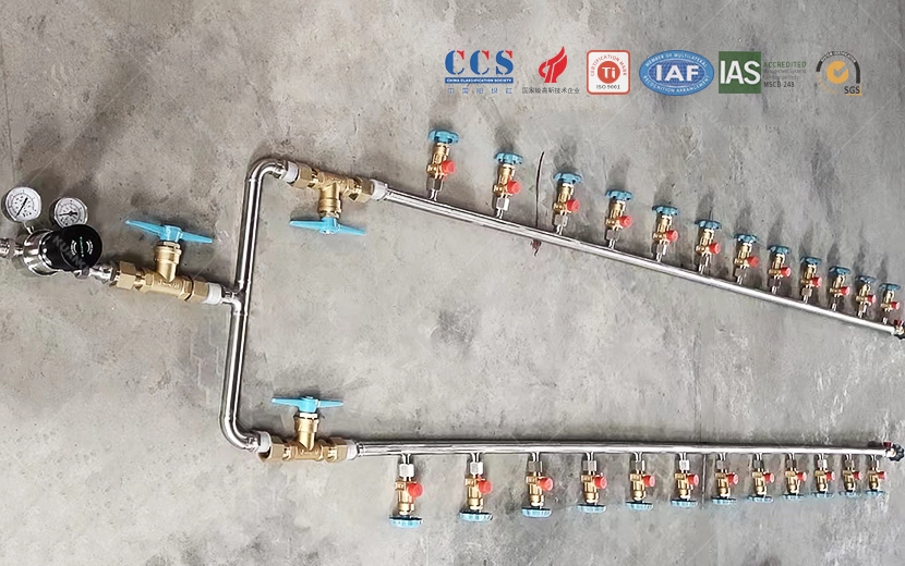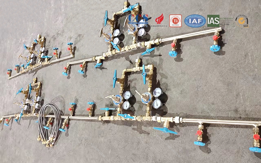 主要配件:高压金属软管 高压直角阀 高压汇流主管 高压截止阀 减压器 低压截止阀