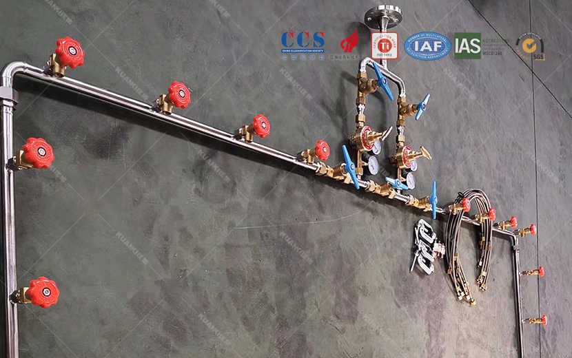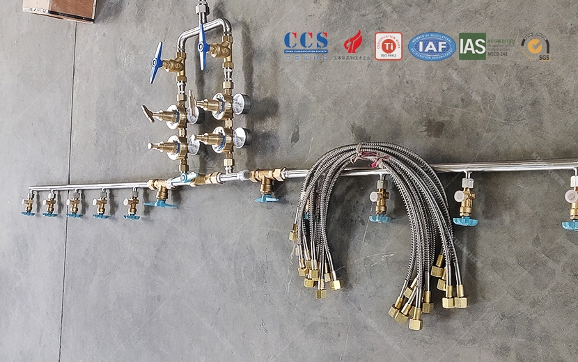 主要配件:高压金属软管 高压直角阀 高压汇流主管 高压截止阀 减压器 低压截止阀