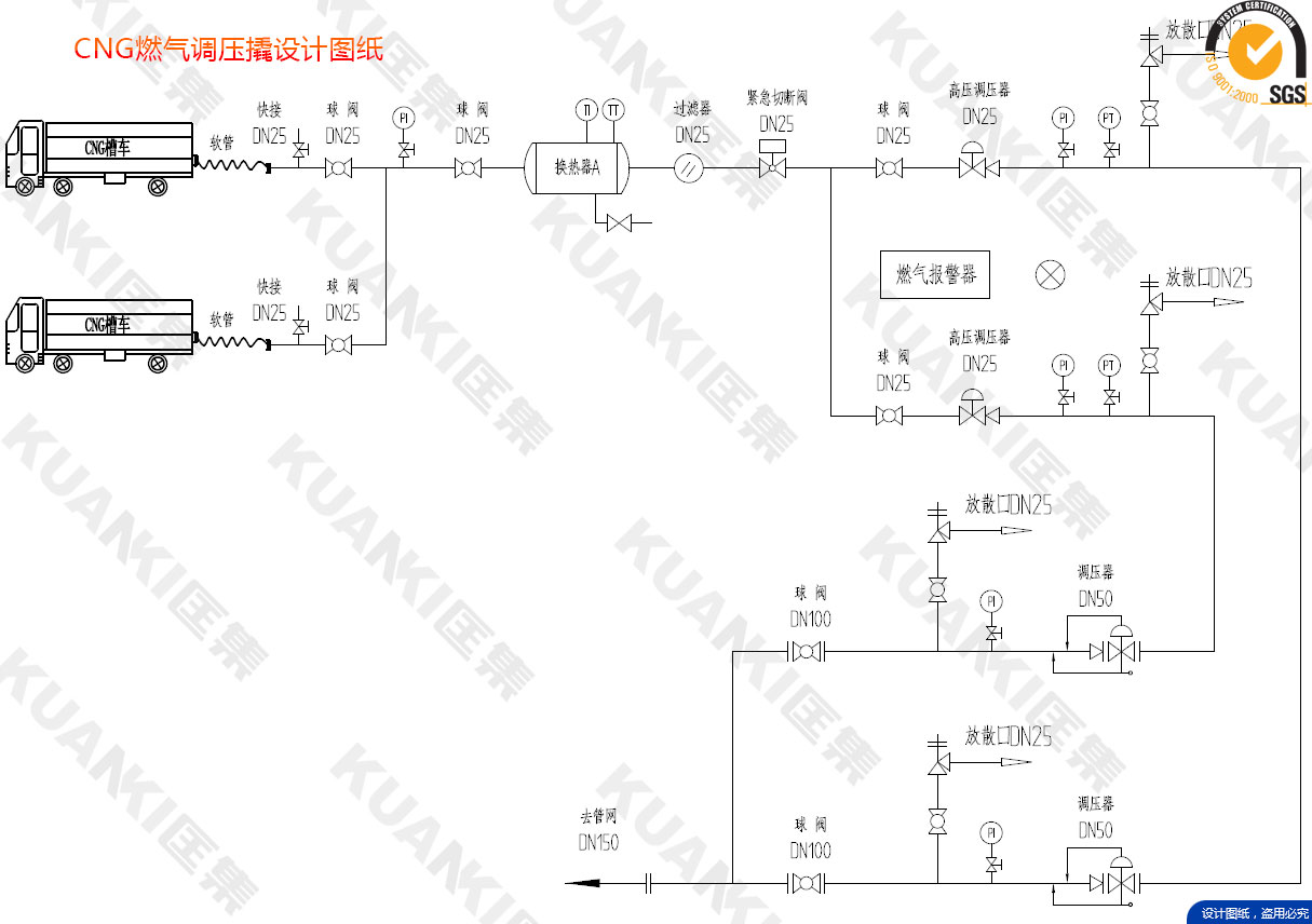 CNG减压撬工作原理:压缩天然气(CNG)是将管输或气井内的天然气经过过滤、脱硫、脱水并压缩(20Mpa)至CNG高压运输撬车(或CNG瓶组、CNG集装箱),撬车将压缩天然气运送至燃气管网暂时无法敷设到的用气城市及单位,通过卸气、过滤、换热(一级)、调压等过程将适当压力的天然气输送到燃气管道。高压天然气减压的过程是一个吸热过程,如果换热不充分。管道会出现结霜或冰堵,严重影响减压设备和减压过程的安全。因此减压前必须进行换热。本减压撬采用电加热换热方式。