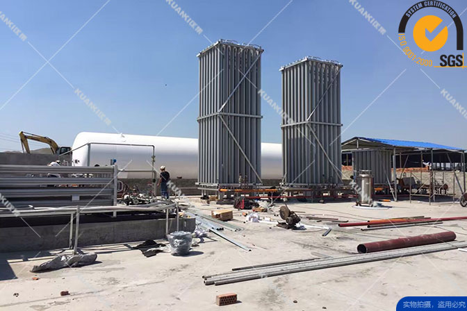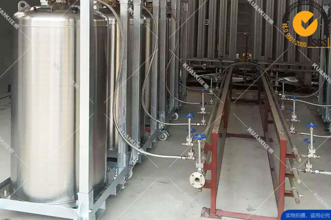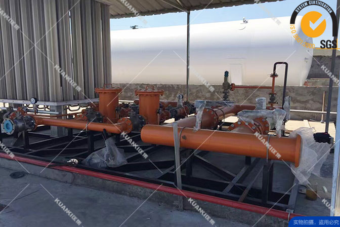 调压计量撬,一种撬块式燃气调压计量装置,由矩形撬块、调节汇管、控制阀、计量管、流量计、调节阀、调节管、过滤器、出气管、进气汇管、进气口、出气汇管、排污管和放气阀组成,其特征在于进气汇管、出气汇管和调节汇管平行排列在矩形撬块上,且与矩形撬块横向平行,调节汇管在前,出气汇管在中,进气汇管在后,在进气汇管和调节管两端之间水平设有两条并联计量管,在每条计量管上逐序设有控制阀、过滤器、压力表、流量计和控制阀;在出气汇管和调节汇管中部之间水平设有两条并联调节管,在每条调节管上逐序设有控制阀、压力表、调节阀和控制阀;在出气汇管上中部设有带90°弯头的出气管,在进气汇管中侧部设有一个进气口;进气汇管和出气汇管上安装安全放气阀。